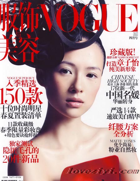 En la portada de la revista Vogue, aparece una nueva y atractiva imagen sexy de la fina y guapa superestrella del cine internacional y la reina del cine chino, Zhang Ziyi, que ha colaborado con afamados estilistas y fotógrafos para cambiar su anterior lujoso estilo sexy que imitaba la modalidad Hollywood. La revista Vogue ha publicado en la portada de su número de abril, 2008, la imagen totalmente de nuevo estilo de la cineasta china para los lectores y fans. (Pueblo en Línea).